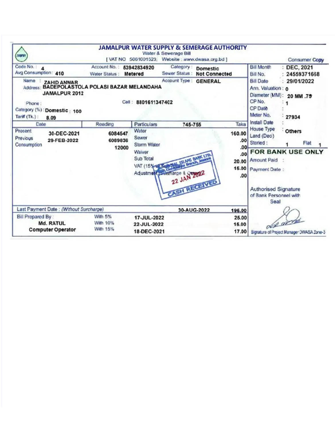 A water and sewerage bill is a regular statement sent to customers by water and sewerage companies, outlining the charges for the provision of water supply and sewage services. These bills typically include details such as the amount of water consumed, sewerage disposal fees, and any additional charges or taxes applicable.